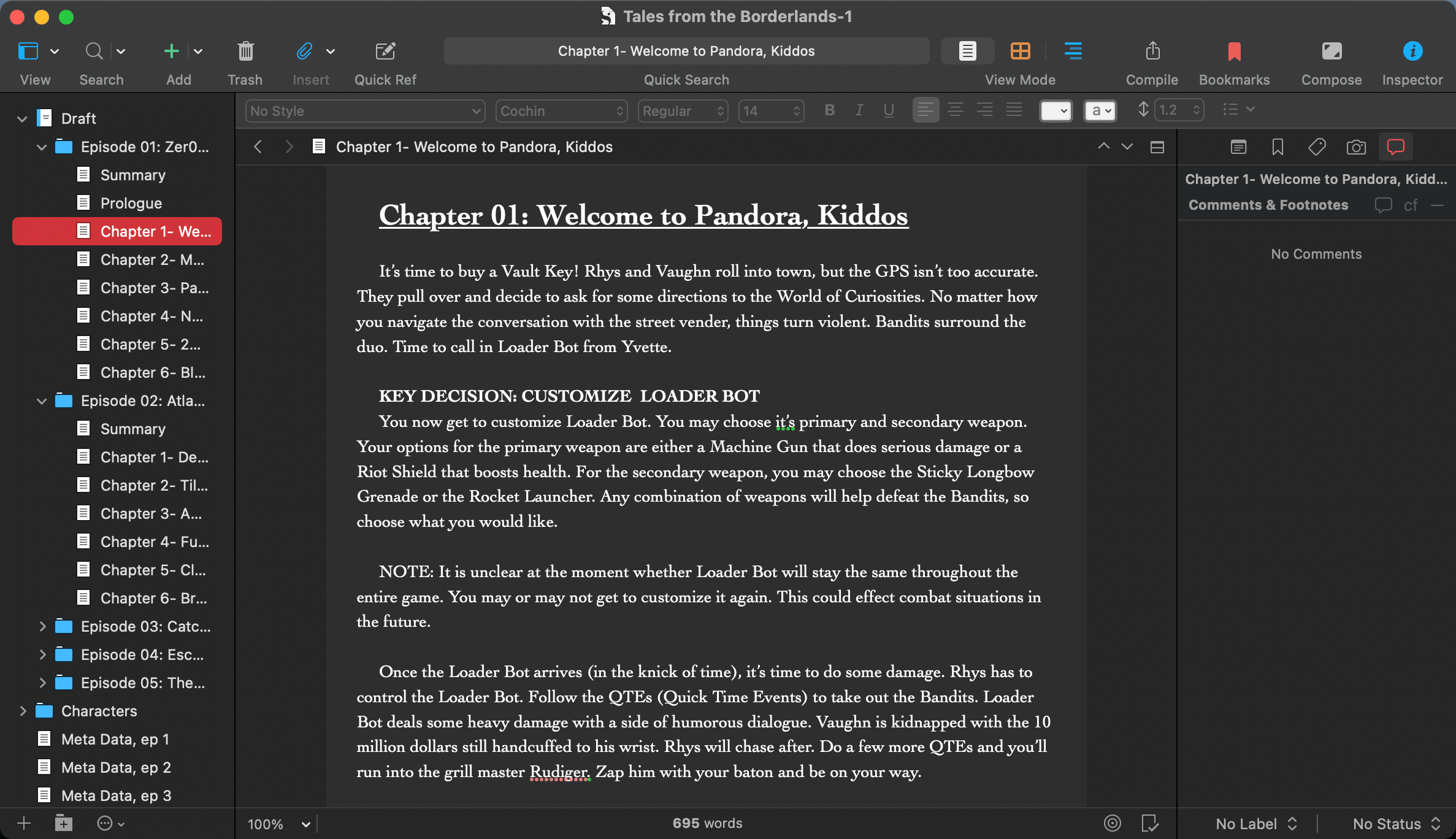 Looking at my project file in Scrivener, my layout is straight forward. Each episode is a folder and each chapter is a document file. I'd write out the chapter's walkthrough with no traditional style: I'd just change the font size or weight manually to delineate structure. While I'd eventually learn how to stylize a guide during the writing process, I did stick with Scrivener for every guide I worked on from then on. It wouldn't be until launching Max Frequency that'd I'd start to ween off the sweet literature latte for other writing apps like MarsEdit and, nowadays, Craft.2 If I was working on wiki guides today, I'd consider sticking with Scrivener out of a sense of familiarity. In reality, switching to something like Craft, BBEdit, or Obsidian would likely be even more powerful.